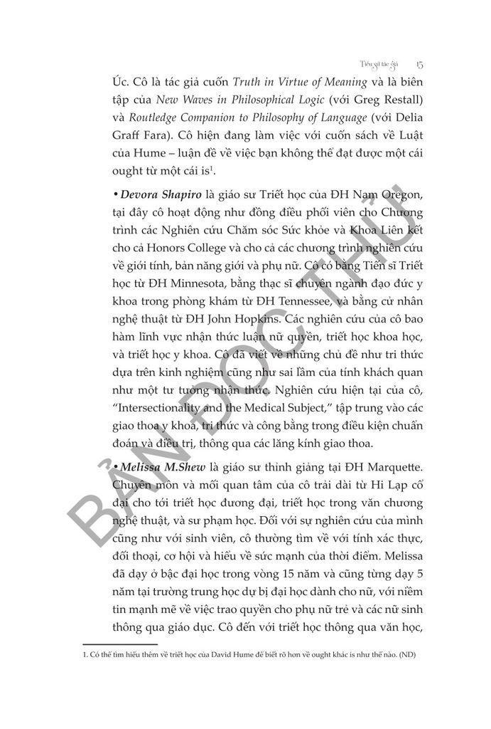 Melissa M. Shew là giáo sư triết học thỉnh giảng tại Đại học Marquette. Chuyên môn và sở thích của cô rất đa dạng, từ Hi Lạp cổ đại đến triết học đương đại, triết học văn chương và nghệ thuật, cho đến sư phạm. Tiến sĩ Shew đã giảng dạy ở cấp đại học mười lăm năm và cũng từng giảng dạy trong năm năm tại một trường dự bị đại học dành cho nữ sinh. Bà sống với niềm tin vững chắc trong việc truyền cảm hứng và sự tự tin cho phụ nữ và con gái thông qua giáo dục. Bà đến với triết học thông qua văn học, âm nhạc, thần thoại, chính trị và nghệ thuật