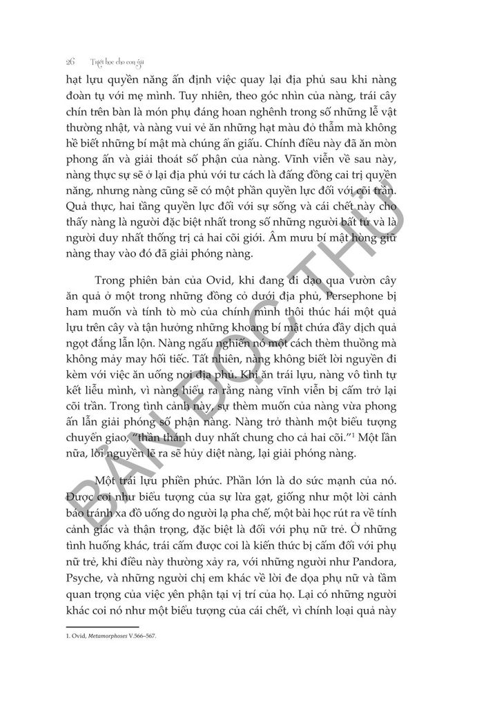 “Triết học cho con gái” giúp lấp đầy sự thiếu khuyết và mờ nhạt ấy của phụ nữ trong triết học. Bắt đầu từ lời giới thiệu với câu chuyện về Persephone, hai biên tập Melissa M. Shew và Kimberly K. Garchar đưa ra cho người đọc lời mời suy tư về việc nhìn nhận Perpephone như một nhân vật chính đúng nghĩa trong câu chuyện của nàng, qua con đường triết học của nàng. Tương tự, các chương về sau đều lấy điển tích về các cô gái và phụ nữ trong thần thoại, lịch sử, nghệ thuật, văn học hoặc khoa học, có thật hoặc không, làm hiện tượng trung tâm để giải thích qua lăng kính triết học.