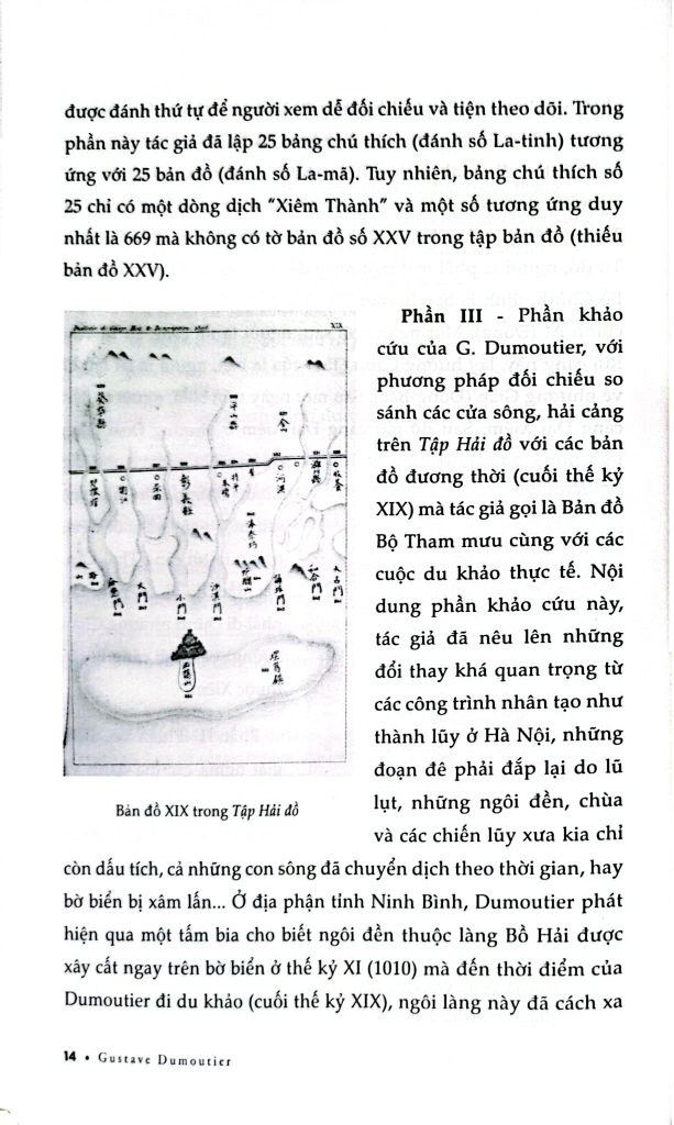 Phần III - Phần khảo cứu của G. Dumoutier, với phương pháp đối chiếu so sánh các cửa sông, hải cảng trên Tập Hải đồ với các bản đồ đương thời (cuối thế kỷ XIX) mà tác giả gọi là Bản đồ Bộ Tham mưu cùng với các cuộc du khảo thực tế. Nội dung phần khảo cứu này, tác giả đã nêu lên những đổi thay khá quan trọng từ các công trình nhân tạo như thành lũy ở Hà Nội, những đoạn đê phải đắp lại do lũ lụt, những ngôi đền, chùa và các chiến lũy xưa kia chỉ còn dấu tích, cả những con sông đã chuyển dịch theo thời gian, hay bờ biển bị xâm lấ