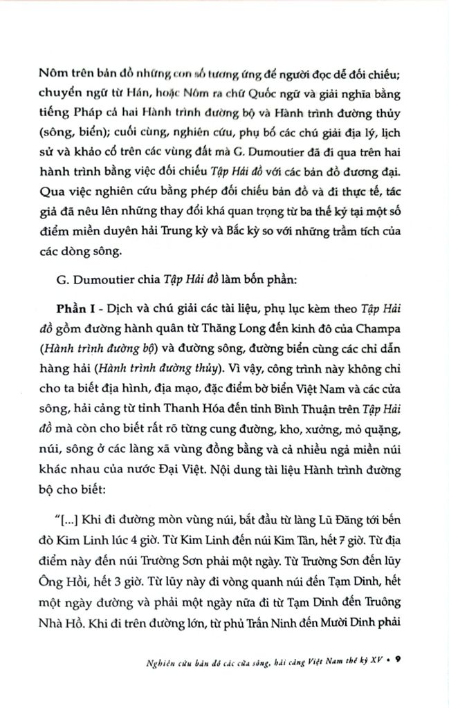 Phần I - Dịch và chú giải các tài liệu, phụ lục kèm theo Tập Hải đồ gồm đường hành quân từ Thăng Long đến kinh đô của Champa (Hành trình đường bộ) và đường sông, đường biển cùng các chỉ dẫn hàng hải (Hành trình đường thủy). Vì vậy, công trình này không chỉ cho ta biết địa hình, địa mạo, đặc điểm bờ biển Việt Nam và các cửa sông, hải cảng từ tỉnh Thanh Hóa đến tỉnh Bình Thuận trên Tập Hải đồ mà còn cho biết rất rõ từng cung đường, kho, xưởng, mỏ quặng, núi, sông ở các làng xã vùng đồng bằng và cả nhiều ngả miền núi khác nhau của nước Đại Việt.