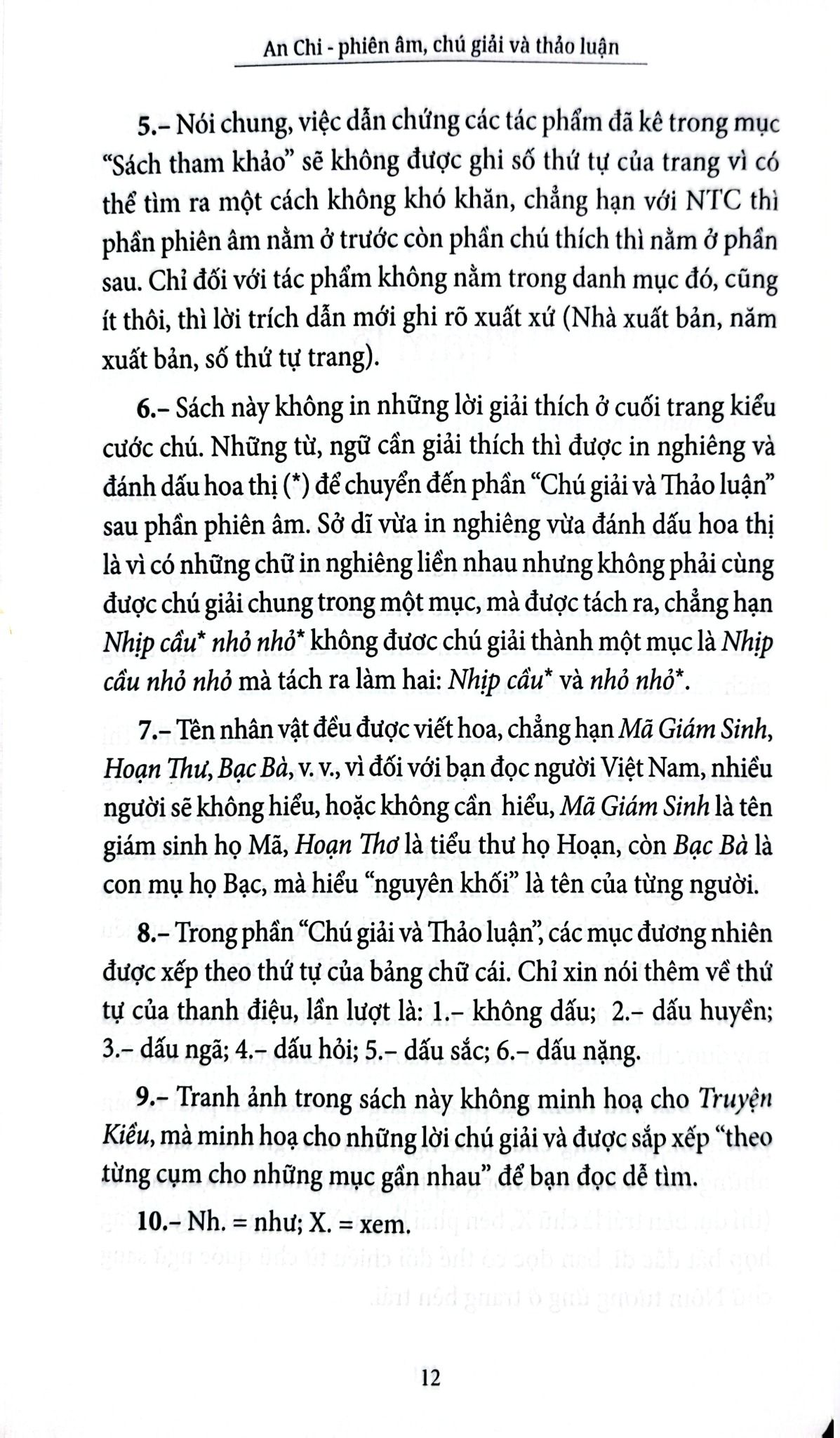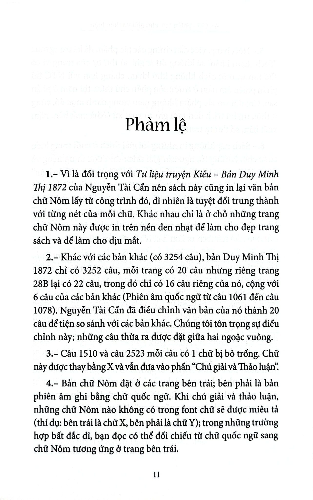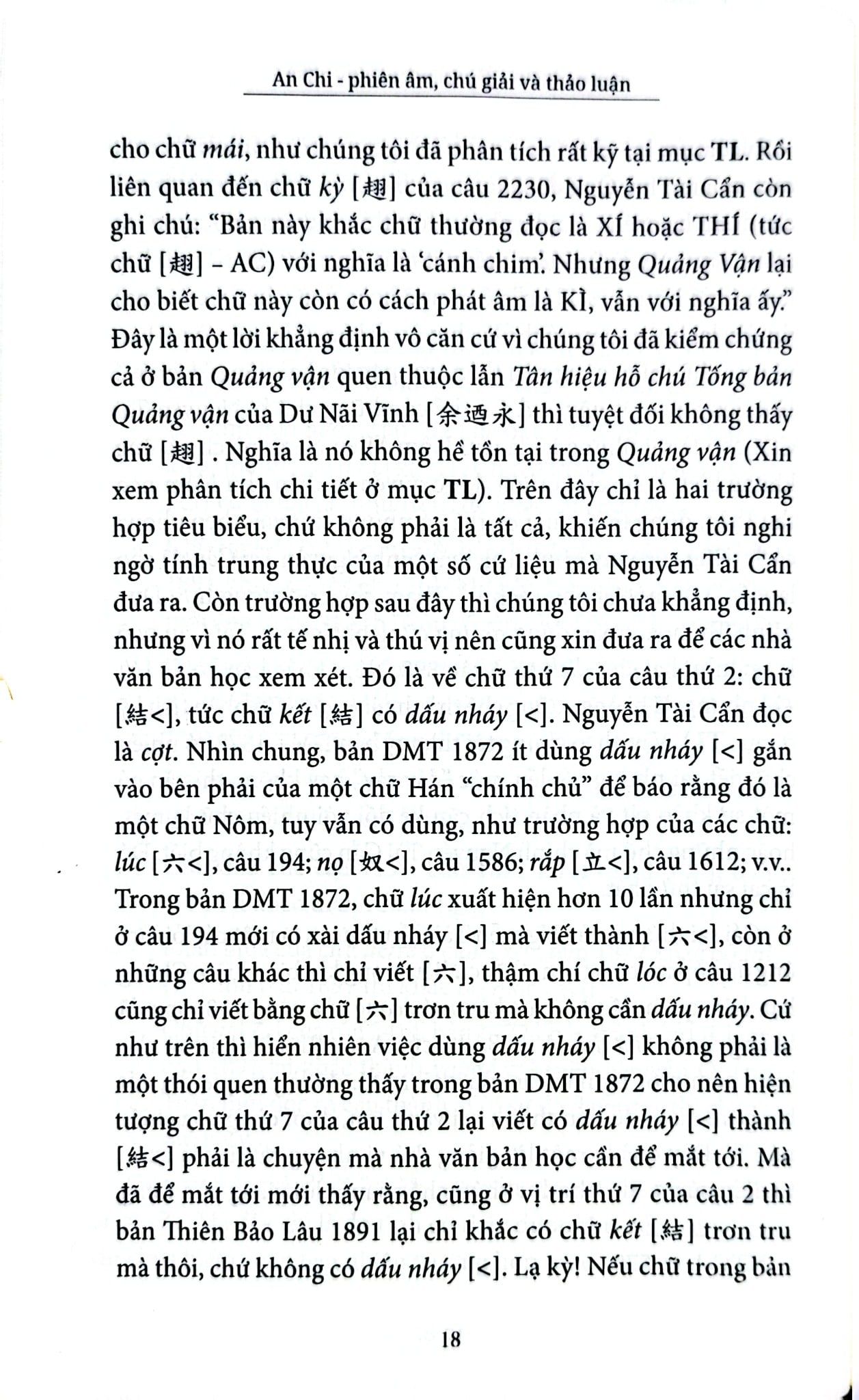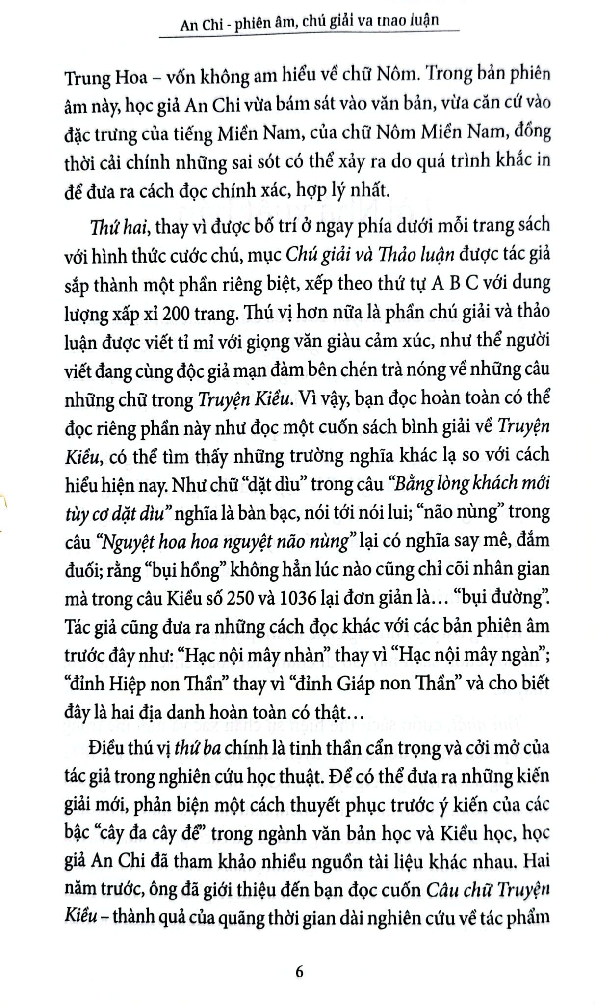 Thứ hai, thay vì được bố trí ở ngay phía dưới mỗi trang sách với hình thức cước chú, mục Chú giải và Thảo luận được tác giả sắp thành một phần riêng biệt, xếp theo thứ tự A B C với dung lượng xấp xỉ 200 trang. Thú vị hơn nữa là phần chú giải và thảo luận được viết tỉ mỉ với giọng văn giàu cảm xúc, như thể người viết đang cùng độc giả mạn đàm bên chén trà nóng về những câu những chữ trong Truyện Kiều. Vì vậy, bạn đọc hoàn toàn có thể đọc riêng phần này như đọc một cuốn sách bình giải về Truyện Kiều, có thể tìm thấy những trường nghĩa khác lạ so với cách hiểu hiện nay. Như chữ “dặt dìu” trong câu “Bằng lòng khách mới tùy cơ dặt dìu” nghĩa là bàn bạc, nói tới nói lui; “não nùng” trong câu “Nguyệt hoa hoa nguyệt não nùng” lại có nghĩa say mê, đắm đuối; rằng “bụi hồng” không hẳn lúc nào cũng chỉ cõi nhân gian mà trong câu Kiều số 250 và 1036 lại đơn giản là… “bụi đường”. Tác giả cũng đưa ra những cách đọc khác với các bản phiên âm trước đây như: “Hạc nội mây nhàn” thay vì “Hạc nội mây ngàn”; “đỉnh Hiệp non Thần” thay vì “đỉnh Giáp non Thần” và cho biết đây là hai địa danh hoàn toàn có thật…