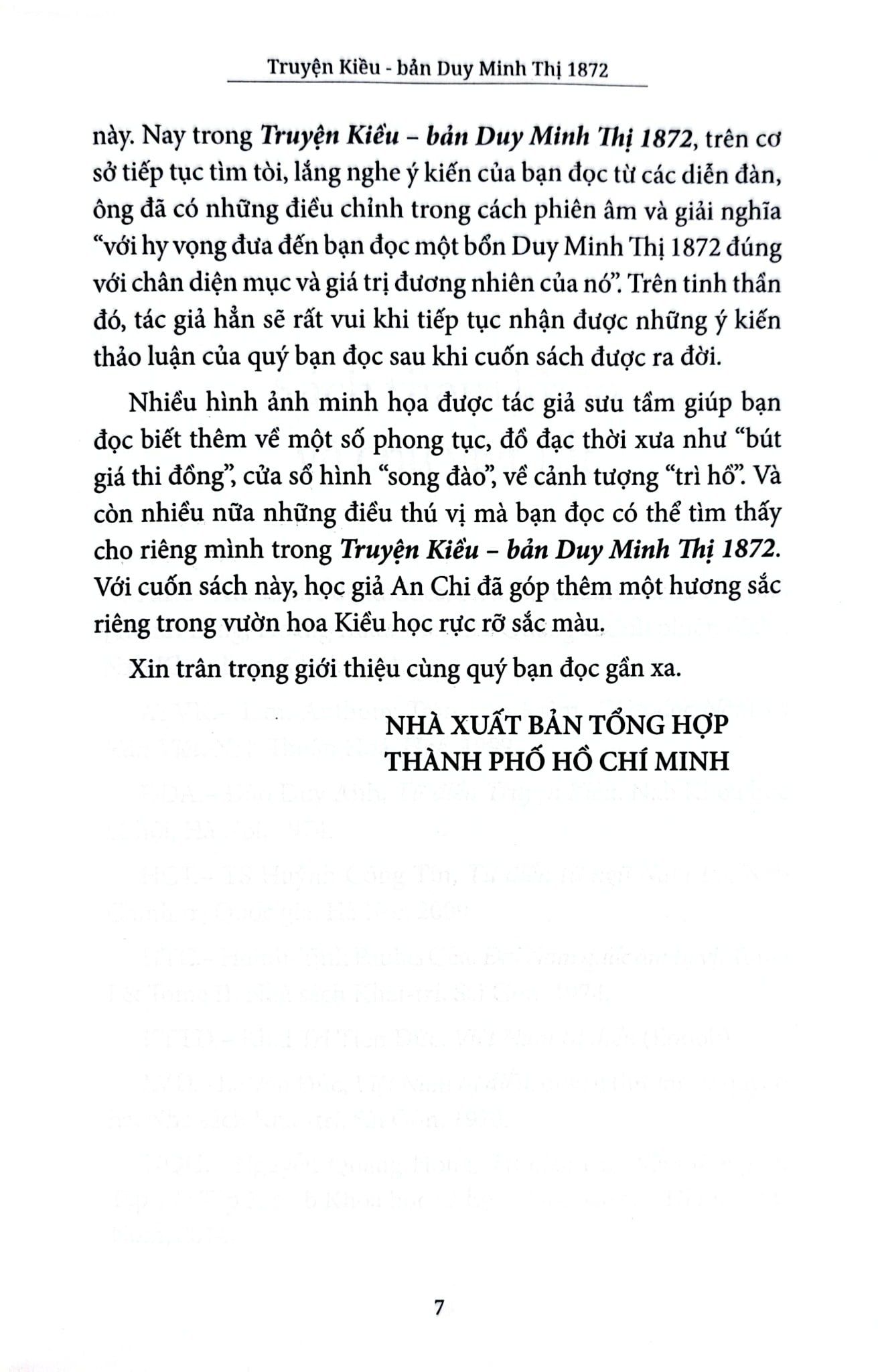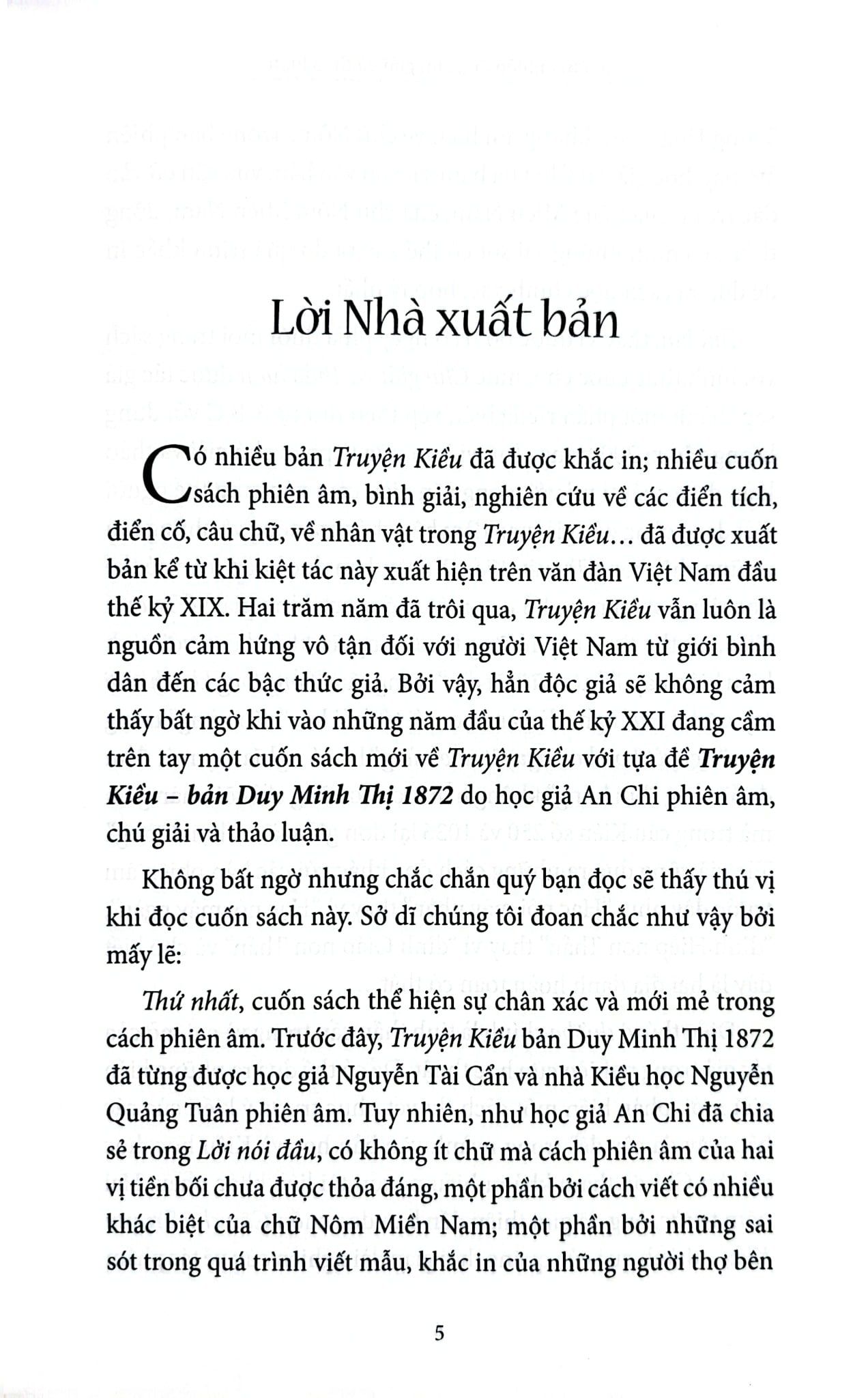 Có nhiều bản Truyện Kiều đã được khắc in; nhiều cuốn sách phiên âm, bình giải, nghiên cứu về các điển tích, điển cố, câu chữ, về nhân vật trong Truyện Kiều… đã được xuất bản kể từ khi kiệt tác này xuất hiện trên văn đàn Việt Nam đầu thế kỷ XIX. Hai trăm năm đã trôi qua, Truyện Kiều vẫn luôn là nguồn cảm hứng vô tận đối với người Việt Nam từ giới bình dân đến các bậc thức giả. Bởi vậy, hẳn độc giả sẽ không cảm thấy bất ngờ khi vào những năm đầu của thế kỷ XXI đang cầm trên tay một cuốn sách mới về Truyện Kiều với tựa đề Truyện Kiều – bản Duy Minh Thị 1872 do học giả An Chi phiên âm, chú giải và thảo luận.