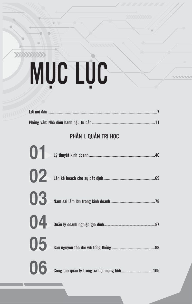 - Phần I - Quản trị học: Trình bày những sai lầm phổ biến trong kinh doanh, sự bất định trong lập kế hoạch, quản lý doanh nghiệp gia đình và các nguyên tắc lãnh đạo từ cấp cao.