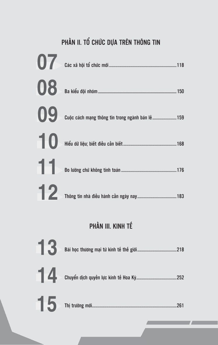 - Phần II - Tổ chức dựa trên thông tin: Phân tích các mô hình tổ chức hiện đại khi thông tin trở thành tài sản cốt lõi và các lớp quản lý trung gian dần bị xóa bỏ.
