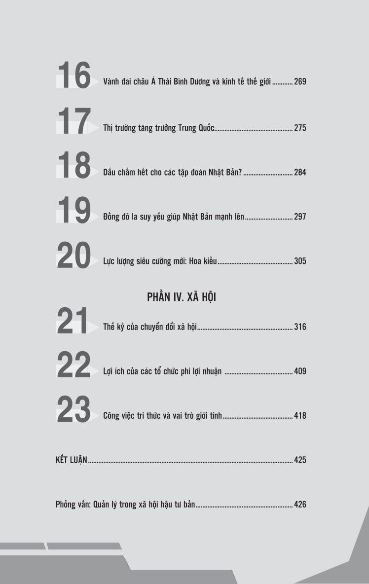- Phần IV - Xã hội: Bàn về chuyển đổi xã hội, các tổ chức phi lợi nhuận và vai trò ngày càng lớn của lao động tri thức.