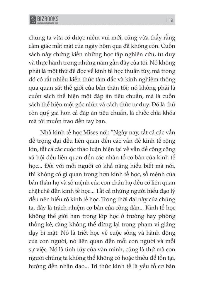 Kinh tế học có thể khiến chúng ta nhìn thấy được chân tướng của thế giới này, có thể khiến chúng ta hiểu được “phúc lợi miễn phí” mà con người hướng đến có phải là miễn phí thật hay không, có thể khiến chúng ta hiểu rõ vô số người tại sao lại có tài nhưng không gặp thời, hiểu được động cơ lương thiện và ý nguyện tốt đẹp, tại sao việc làm và kết quả luôn luôn trái ngược nhau, phương pháp và mục đích rốt cuộc có quan hệ như thế nào.
