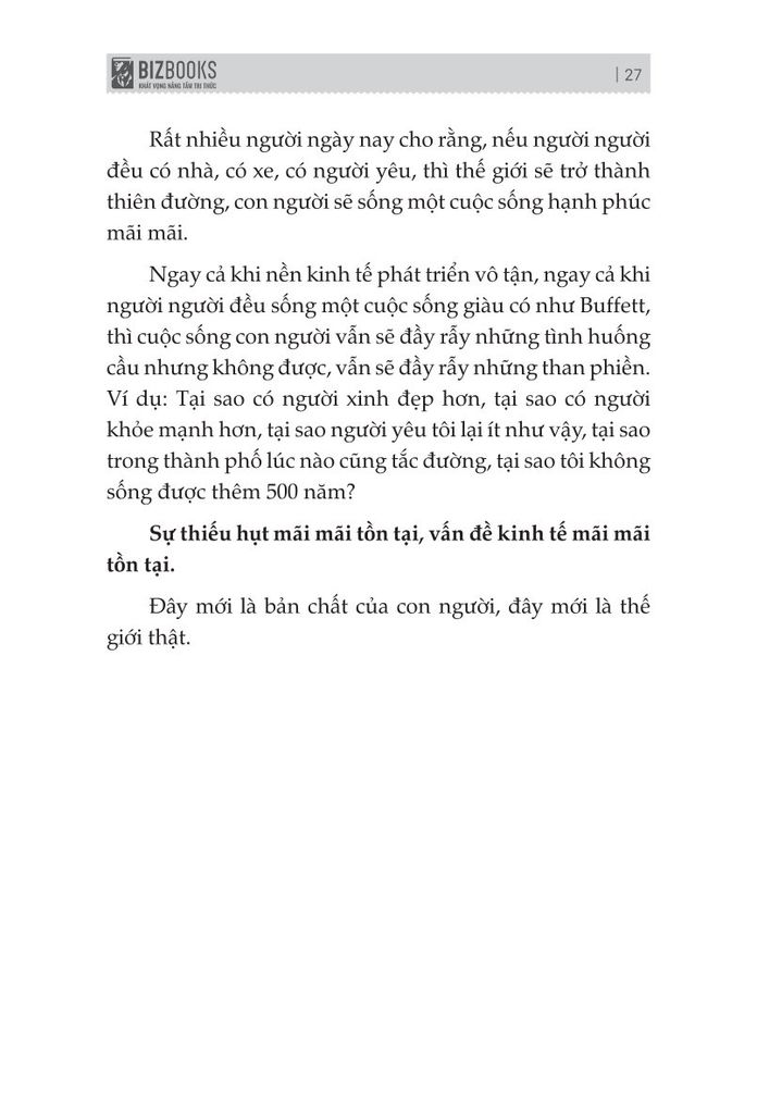 Ngay cả khi nền kinh tế phát triển vô tận, ngay cả khi người người đều sống một cuộc sống giàu có như Buffett, thì cuộc sống con người vẫn sẽ đầy rẫy những tình huống cầu nhưng không được, vẫn sẽ đầy rẫy những than phiền. Ví dụ: Tại sao có người xinh đẹp hơn, tại sao có người khỏe mạnh hơn, tại sao người yêu tôi lại ít như vậy, tại sao trong thành phố lúc nào cũng tắc đường, tại sao tôi không sống được thêm 500 năm?