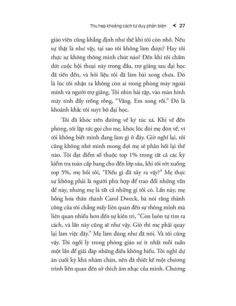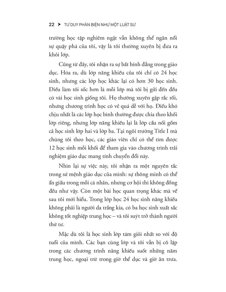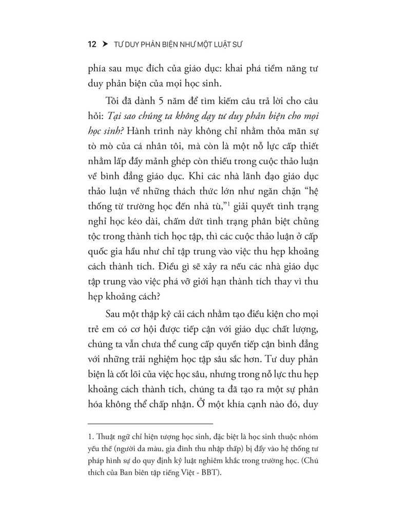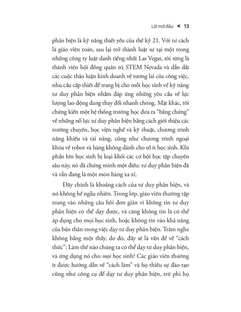 Tác giả mở đầu bằng chính hành trình cá nhân – từ một học sinh nghèo ở Brooklyn, từng bị đánh giá thấp, đến khi được tiếp cận với phương pháp giáo dục chất lượng. Ông đặt vấn đề rằng tư duy phản biện không phải là đặc quyền, mà là quyền cơ bản, và khoảng cách trong khả năng tư duy giữa các học sinh thực chất là khoảng cách về cơ hội và kỳ vọng. Phần này cũng mở rộng khái niệm "tư duy phản biện thực sự là gì" và vì sao nó lại thách thức đến vậy.