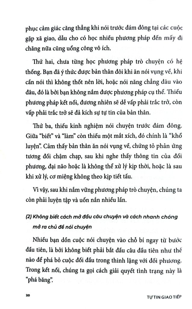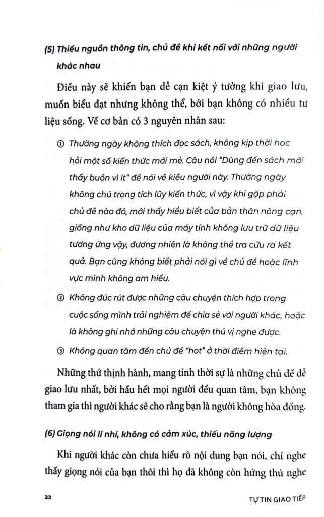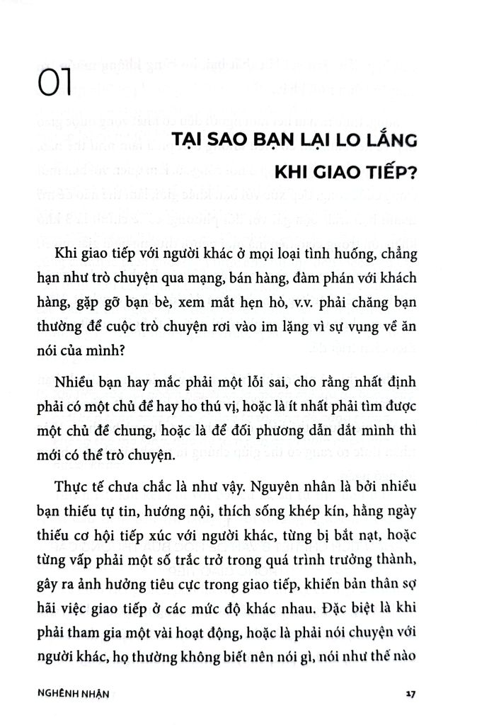 Nhiều người cho rằng nhất định phải có một chủ đề hay ho thú vị, hoặc là ít nhất phải tìm được một chủ đề chúng, hoặc là để đối phương dẫn dắt mình thì mới có thể trò chuyện. Thực tế chưa chắc là vậy. Nguyên nhân là bởi nhiều bạn thiếu tự tin, hướng nội, thích sống khép kín, hằng ngày thiếu cơ hội tiếp xúc với người khác, từng bị bắt nạt, hoặc từng vấp phải một số trắc trở trong quá trình trưởng thành, gây ra ảnh hưởng tiêu cực trong giao tiếp, khiến bản thân sợ hãi việc giao tiếp ở các mức độ khác nhau. Đặc biệt là khi phải tham gia một vài hoạt động, hoặc là phải nói chuyện với người khác, họ thường không biết nên nói gì, nói như thế nào.