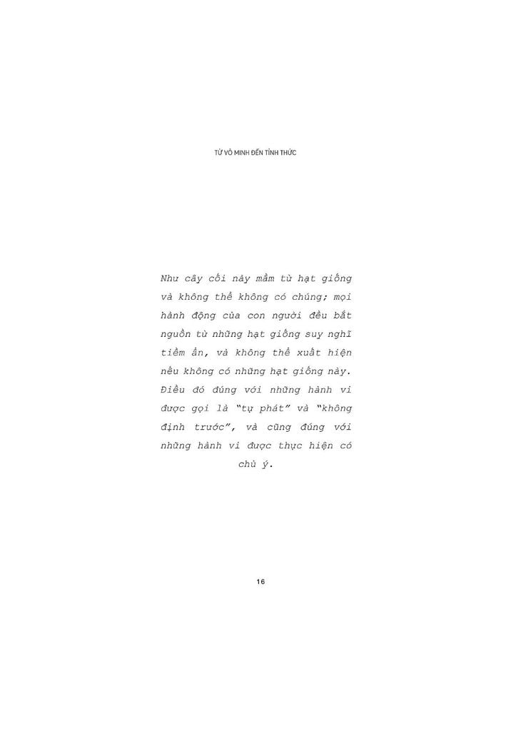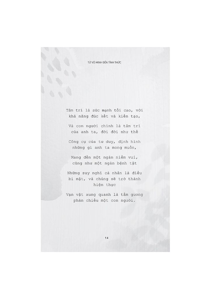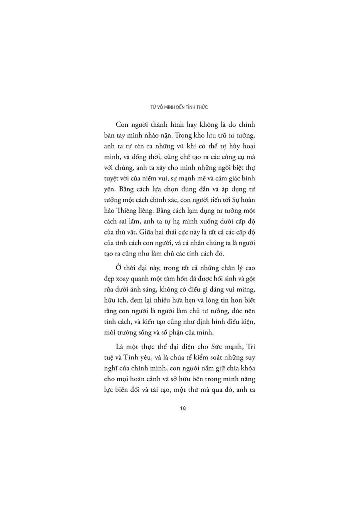 As a man thinketh – Từ vô minh đến tỉnh thức là tuyển tập những tác phẩm nổi tiếng nhất của triết gia thiên tài người Anh – James Allen. Cuốn sách này là những dòng suy ngẫm của tác giả về bản chất con người, với tư cách là một cá thể độc lập cũng như một thành viên của xã hội. Thế giới bên ngoài, rực rỡ, đẹp đẽ hay tăm tối xấu xa, hoàn toàn phụ thuộc vào cách ta nuôi dưỡng thế giới nội tâm của mình. Trong hành trình vun xới cho khu vườn tâm trí ấy, liệu ta có biếng lười mà thả mình theo những cám dỗ ngọt ngào hiểm ác, hay sẽ can đảm lựa chọn một con đường dẫu gian lao nhưng lương thiện, trong sáng và được ban phước lành?