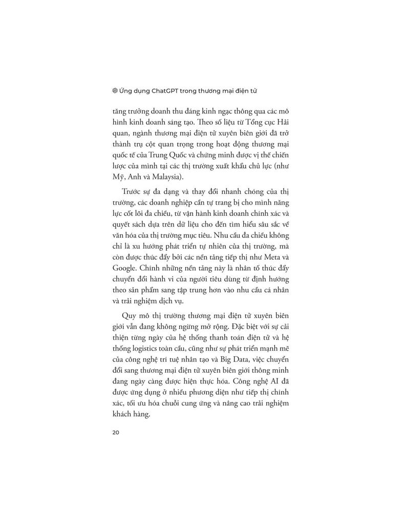 Ứng dụng ChatGPT trong Thương mại điện tử cung cấp cho người đọc một cái nhìn hệ thống và thực tiễn về cách khai thác ChatGPT trong các hoạt động cốt lõi của thương mại điện tử. Cuốn sách giúp người đọc hiểu bản chất, vai trò và giới hạn của ChatGPT, từ đó sử dụng công cụ này như một trợ lý thông minh trong công việc hằng ngày.