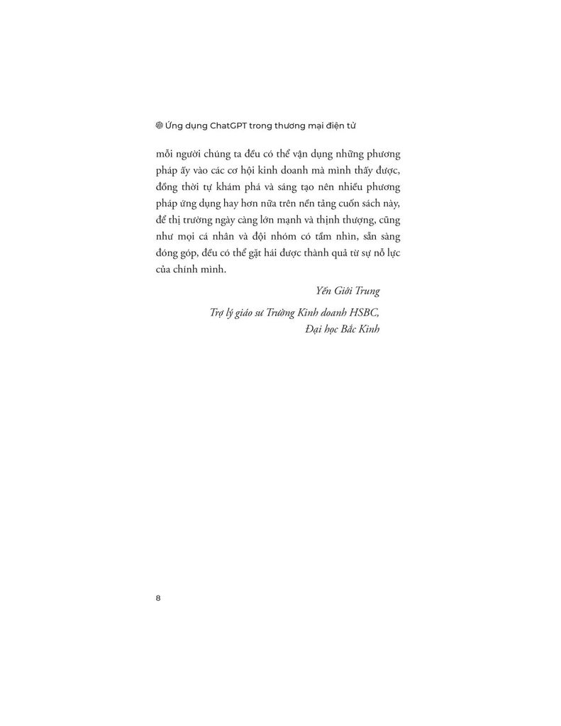 Ứng dụng ChatGPT trong Thương mại điện tử dành cho những người bán hàng trực tuyến, người làm marketing, quản lý doanh nghiệp nhỏ và vừa, sinh viên ngành kinh tế - thương mại, cũng như những ai quan tâm đến việc ứng dụng trí tuệ nhân tạo vào hoạt động kinh doanh. Cuốn sách không chỉ cung cấp kiến thức và phương pháp, mà còn góp phần định hình một tư duy làm việc mới - nơi con người và AI cùng phối hợp để tạo ra giá trị bền vững trong kỷ nguyên số.