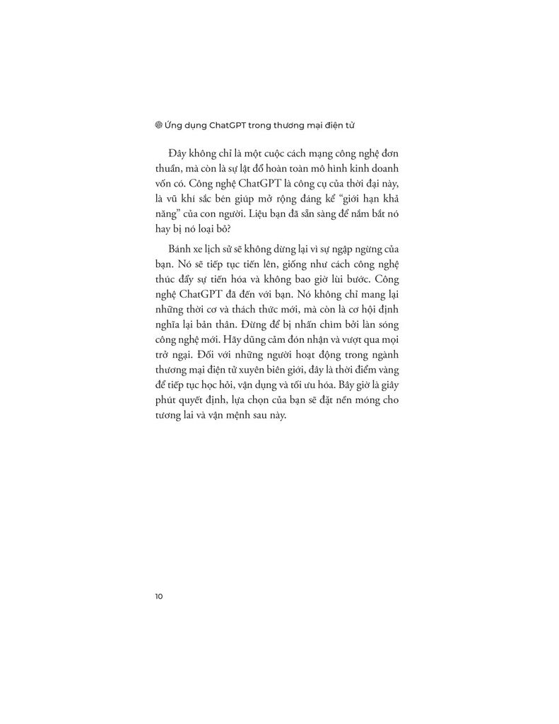 Bên cạnh việc tập trung vào hiệu quả, sách cũng đề cập đến những giới hạn và rủi ro khi sử dụng ChatGPT trong thương mại điện tử, từ việc phụ thuộc quá mức vào công cụ đến các vấn đề liên quan đến dữ liệu và tính chính xác của thông tin. Qua đó, người đọc được trang bị một góc nhìn cân bằng, giúp khai thác tối đa lợi ích của ChatGPT mà vẫn duy trì được sự chủ động và trách nhiệm trong hoạt động kinh doanh.