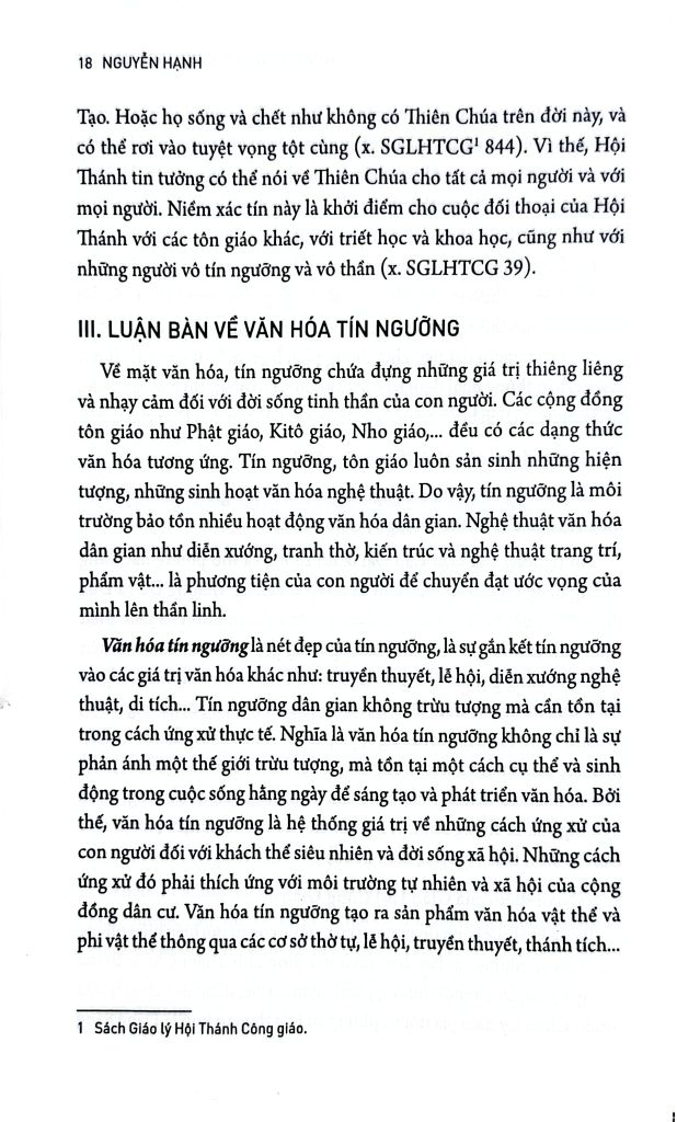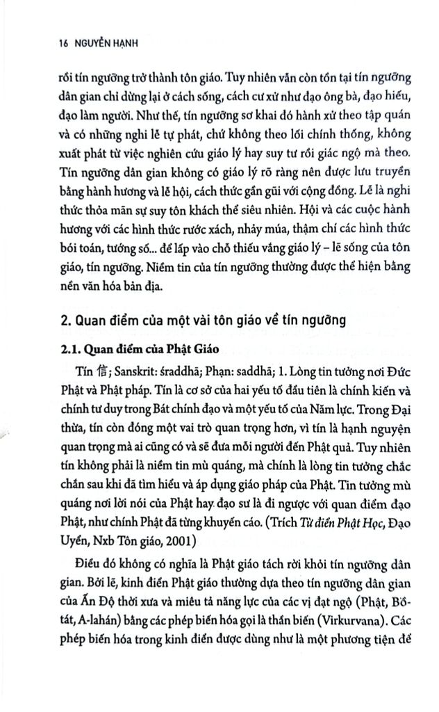 Tác phẩm Văn Hóa Tín Ngưỡng Việt Nam của tác giả Nguyễn Hạnh là tác phẩm biên khảo về tín ngưỡng của người Việt khởi từ thời dựng nước với khái niệm thờ: Trời, đất, tổ tiên. Những niềm tin dân gian của ông bà ta xưa vẫn còn lưu truyền đến ngày nay thông qua kho tàng ca dao.Tiếp đến là sự giao thoa văn hóa với 4 tôn giáo lớn ở Việt Nam là Nho, Phật, Lão, Công Giáo. Chính sự giao thoa giữa tín ngưỡng dân gian Việt Nam và 4 tôn giáo lớn này đã hình thành nên nhiều tôn giáo bản địa như Cao Đài, Hòa Hảo, Hòa Đồng Tôn Giáo. Sự giao thoa, tiếp thu và chọn lọc đó đã làm nên một đặc sắc trong chiều kích tâm linh đó là các tôn giáo du nhập phải được điều chỉnh và chứa đựng được yếu tố tín ngưỡng của người Việt. Chính những ảnh hưởng giao thoa này góp phần tạo nên bản sắc văn hóa, tín ngưỡng của người Việt xuyên suốt từ thuở dựng nước đến nay.