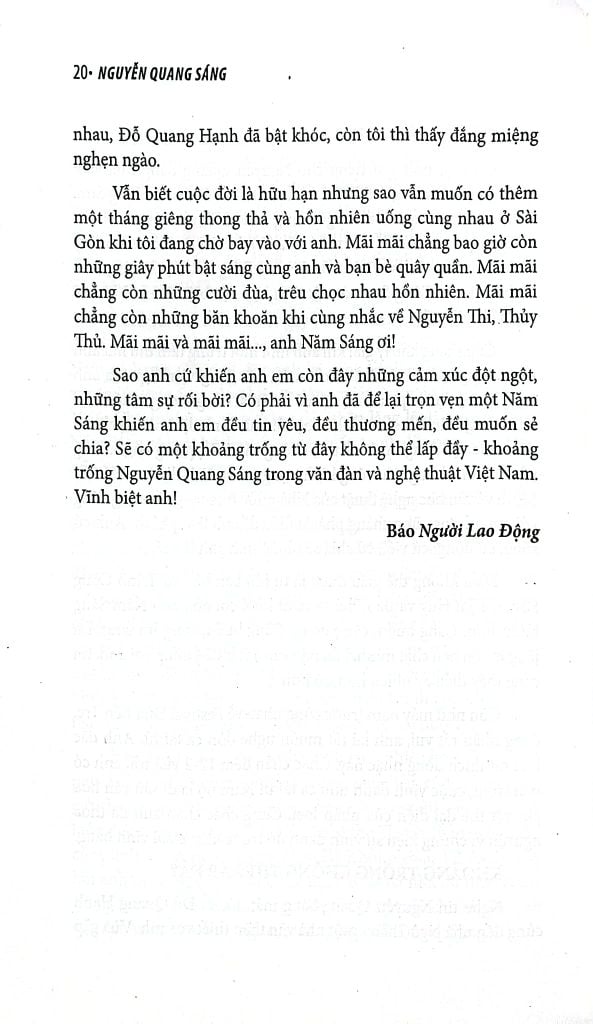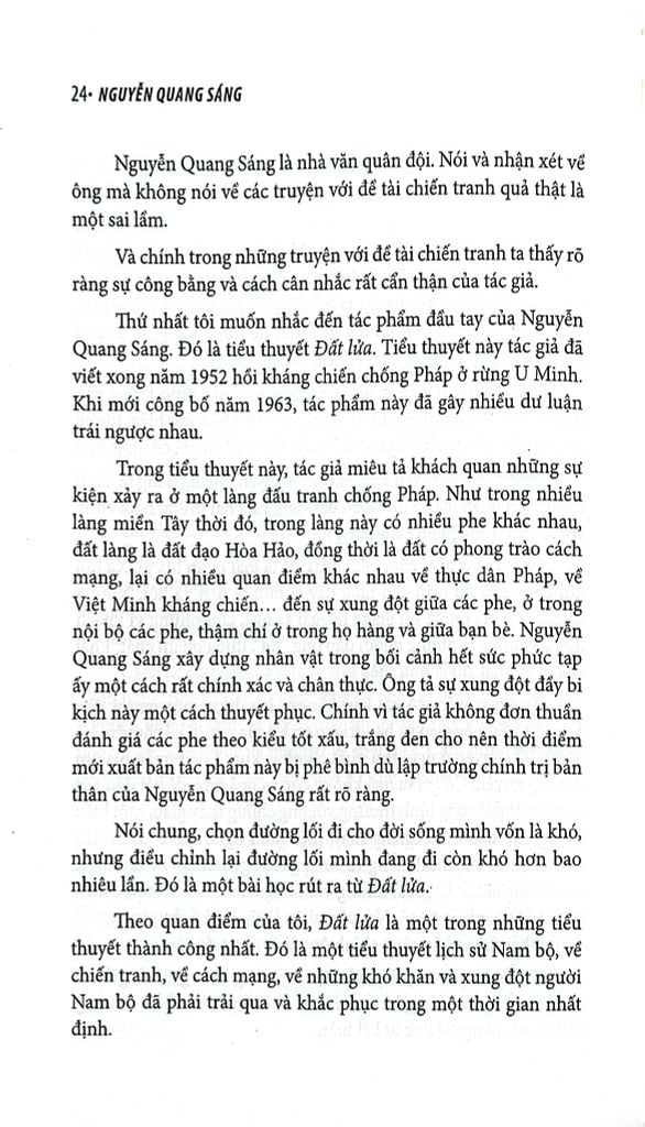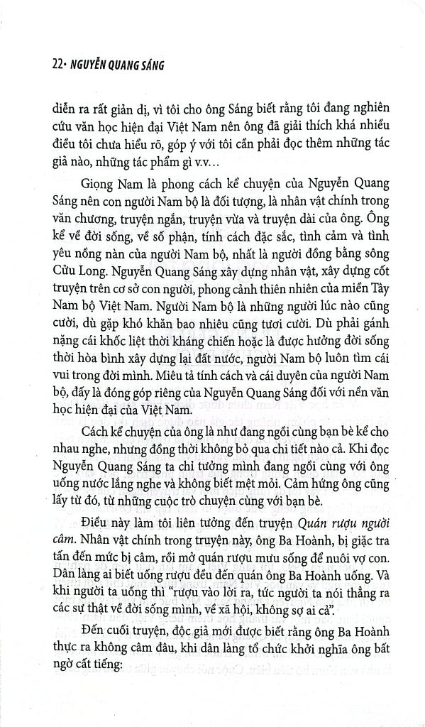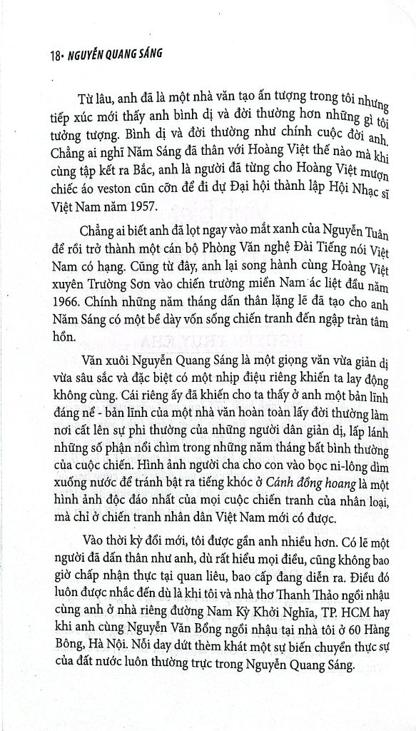 Nguyễn Quang Sáng bắt đầu sáng tác khi còn khá trẻ. Giọng văn của ông giản dị, mộc mạc nhưng phản ánh chân thật giá trị cuộc sống. Từng lời văn, câu chuyện đưa tâm hồn độc giả đến với giá trị nhân văn sâu sắc. Độc giả sẽ chẳng bao giờ quên bé Thu trong Chiếc lược ngà và những lát cắt cảm xúc khó phai trong Mùa gió chướng, Cánh đồng hoang... - những tác phẩm đi cùng giai đoạn lịch sử hào hùng của dân tộc.