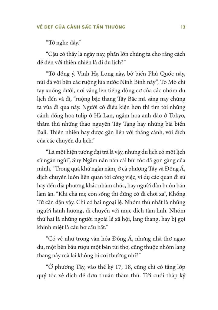 Cuốn sách “Vẻ đẹp của cảnh sắc tầm thường” mở ra những con đường mới để mỗi người có thể phát triển khả năng rung động và kết nối sâu sắc với mọi hình thái của thiên nhiên, thay vì chỉ với những phong cảnh hợp Instagram. Hành trình của Tò Mò và Suy Ngẫm cũng giúp ta đi xuyên qua vẻ bề ngoài để cảm nhận được vẻ đẹp của sự phong phú, phức tạp và bí ẩn của âm thanh và mùi vị; của chuồn chuồn, nhện và bướm di cư; của đầm lầy, hoa tàn và lúc xấu trời - những điều mà trước kia ta coi là bình thường, thậm chí tầm thường, xấu xí.