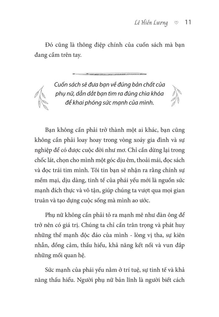 Theo tác giả, cách hiệu quả nhất chính là tự tin phát huy thế mạnh đặc trưng của phụ nữ - khả năng quán xuyến nhiều việc, sự tinh tế, thấu hiểu và kiên trì.
