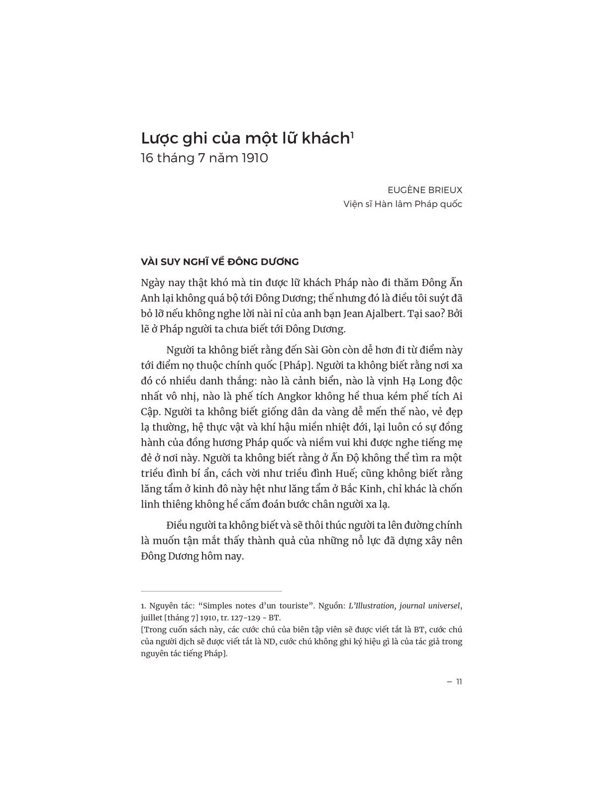 Ngay từ những trang đầu, bài “Lược ghi của một lữ khách” của học giả Brieux - Viện sĩ Hàn lâm Pháp - mở ra bằng những quan sát chân thực và sắc sảo về mối quan hệ giữa mẫu quốc và thuộc địa. Brieux thẳng thắn phê phán sự ngạo mạn của nền văn minh Pháp, đồng thời bày tỏ sự trân trọng đối với vẻ tao nhã, lễ độ và đạo lý xã hội cổ truyền của người An Nam– như những tiếng vọng xa xăm từ một nền văn hóa bền bỉ trước sóng gió chính trị.