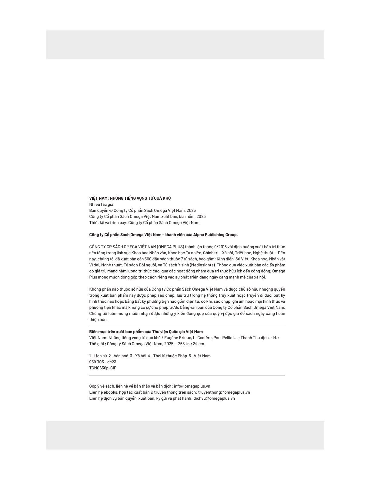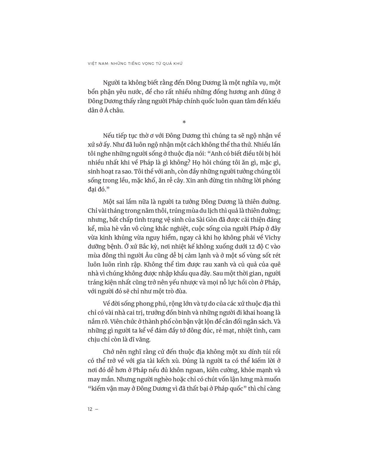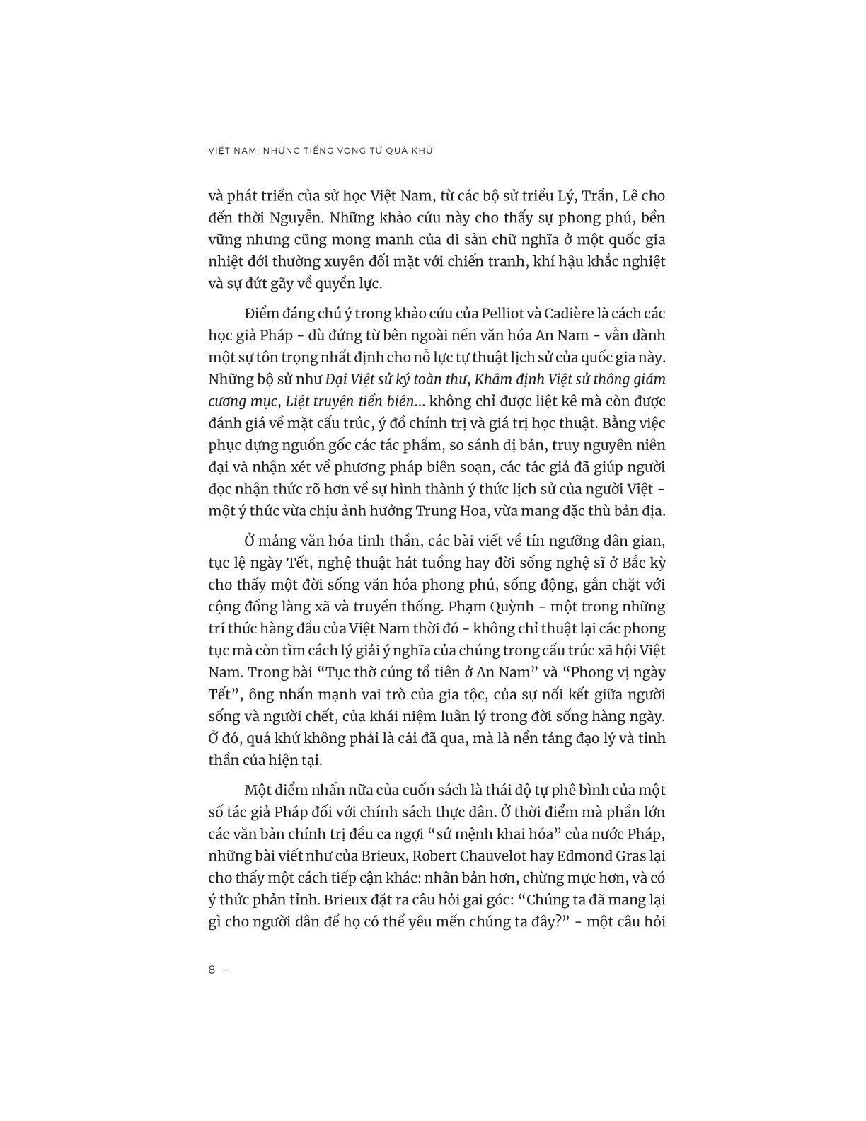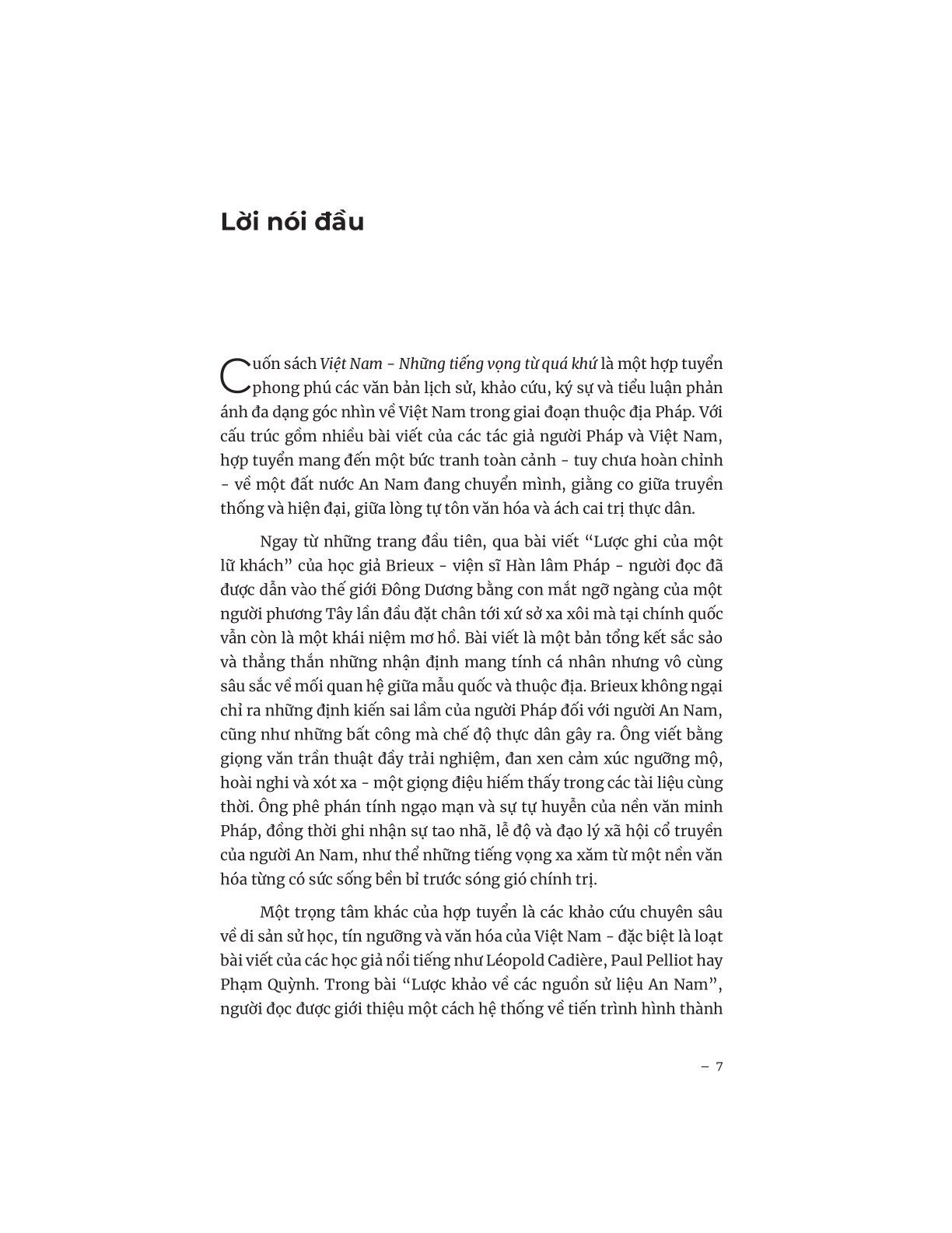 “Việt Nam - Những tiếng vọng từ quá khứ” là một hợp tuyển phong phú gồm các văn bản lịch sử, khảo cứu, ký sự và tiểu luận về Việt Nam trong thời kỳ thuộc địa Pháp, khi nước ta đang chuyển mình giữa truyền thống và hiện đại, giữa lòng tự tôn văn hóa và ách cai trị thực dân của các học giả Pháp và Việt Nam.
