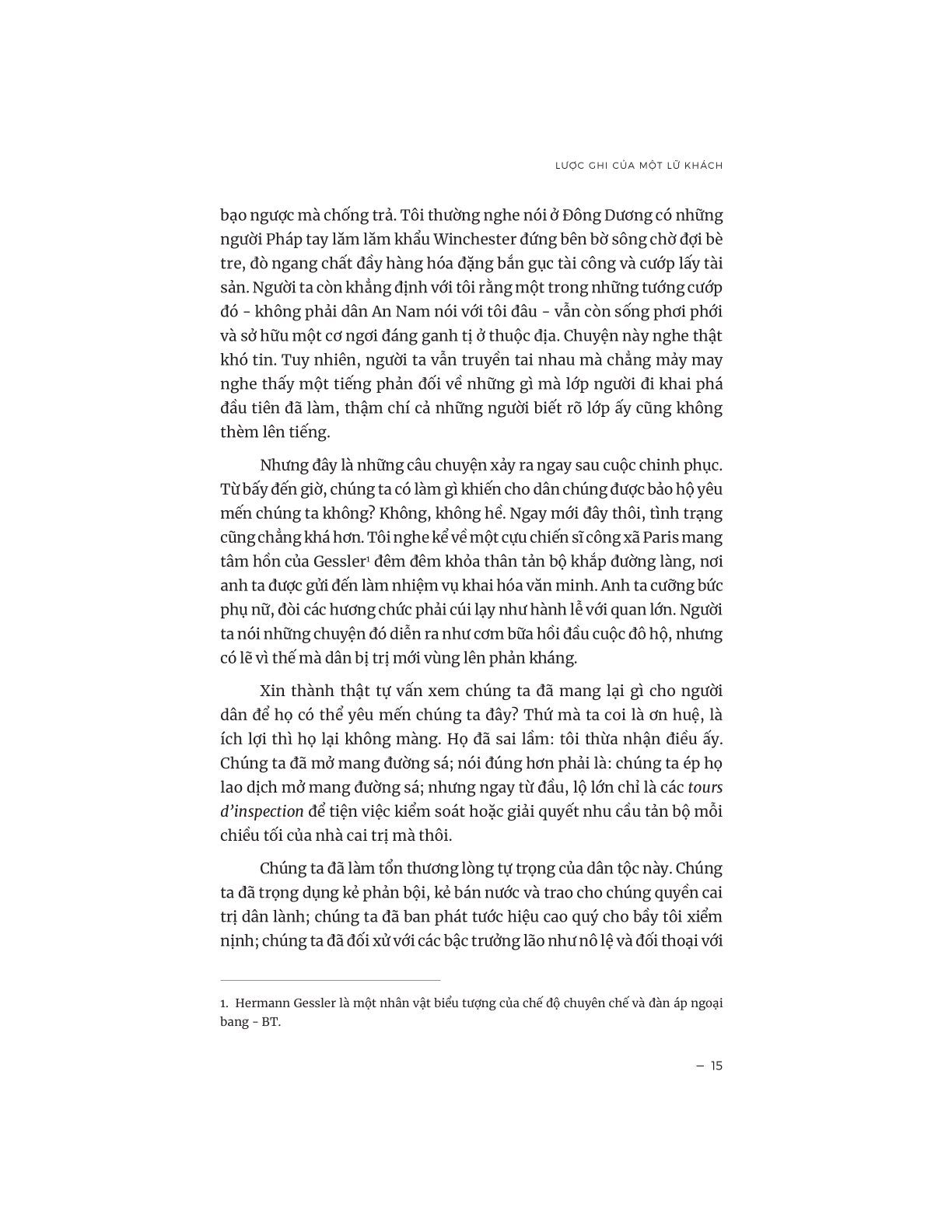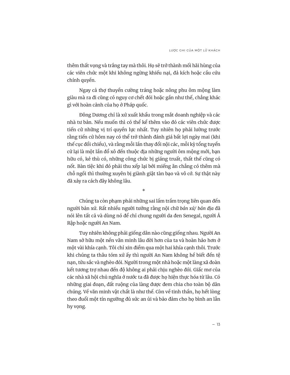 “Người An Nam sở hữu một nền văn minh lâu đời hơn của ta và hoàn hảo hơn ở một vài khía cạnh. Tôi chỉ xin điểm qua một hai khía cạnh thôi. Trước khi chúng ta thâu tóm xứ ấy thì người An Nam không hề biết đến tệ nạn, tửu sắc và nghèo đói. Người trong một nhà hoặc một làng xã đoàn kết tương trợ nhau đến độ không ai phải chịu nghèo đói. Giấc mơ của các nhà xã hội chủ nghĩa ở nước ta đã được họ hiện thực hóa từ lâu. Có những giai đoạn, đất ruộng của làng được đem chia cho toàn bộ dân chúng. Về văn minh vật chất là như thế. Còn về tinh thần, họ hết lòng theo đuổi một tín ngưỡng đủ sức an ủi và bảo đảm cho họ bình an lẫn hy vọng.” (trích Lược ghi của một lữ khách)