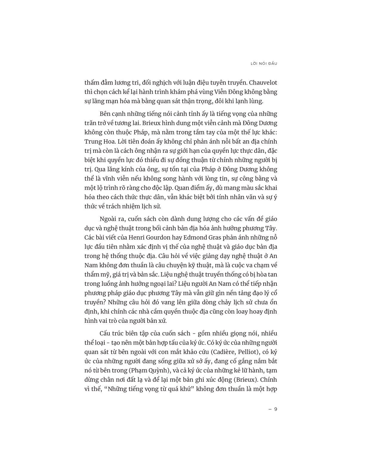 Với cấu trúc đa giọng - từ các học giả khảo cứu, trí thức bản địa đến những lữ khách phương xa - cuốn sách như một bản hợp tấu ký ức. Ở đó vang lên những tiếng nói khác nhau, đôi khi đối lập, nhưng cùng góp phần tái hiện chân thực một giai đoạn lịch sử phức tạp và nhiều tầng lớp.
