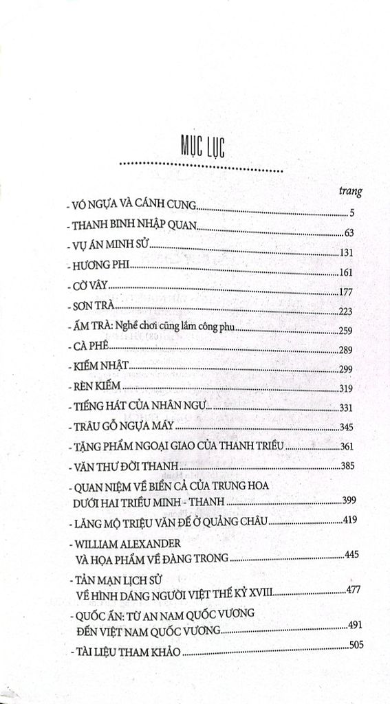 Những tiểu luận nghiên cứu về hoạt động của cung đình nhà Thanh như: Tặng phẩm ngoại giao của Thanh triều, Văn thư đời Thanh… Quan niệm về biển cả của Trung Hoa dưới hai triều Minh – Thanh phân tích rõ những chính sách về biển cả của Trung Hoa chỉ chú trọng đến việc “hải phòng” và “hải cấm”, chớ biển cả không phải là mục tiêu mà người Trung Hoa cần chinh phục. Nghiên cứu trên cũng chỉ ra rằng những giải thích về lãnh hải của nhà đương cục Trung Hoa hiện nay hoàn toàn thiếu cơ sở và sai lệch so với sử sách. Ngoài ra quyển sách còn có các tiểu luận về văn hóa như: cờ vây, ấm trà, sơn trà, cà phê, rèn kiếm… cùng những nghiên cứu về xã hội và con người Việt Nam cuối thế kỷ XVIII, đặc biệt là qua các họa phẩm của William Alexander.
