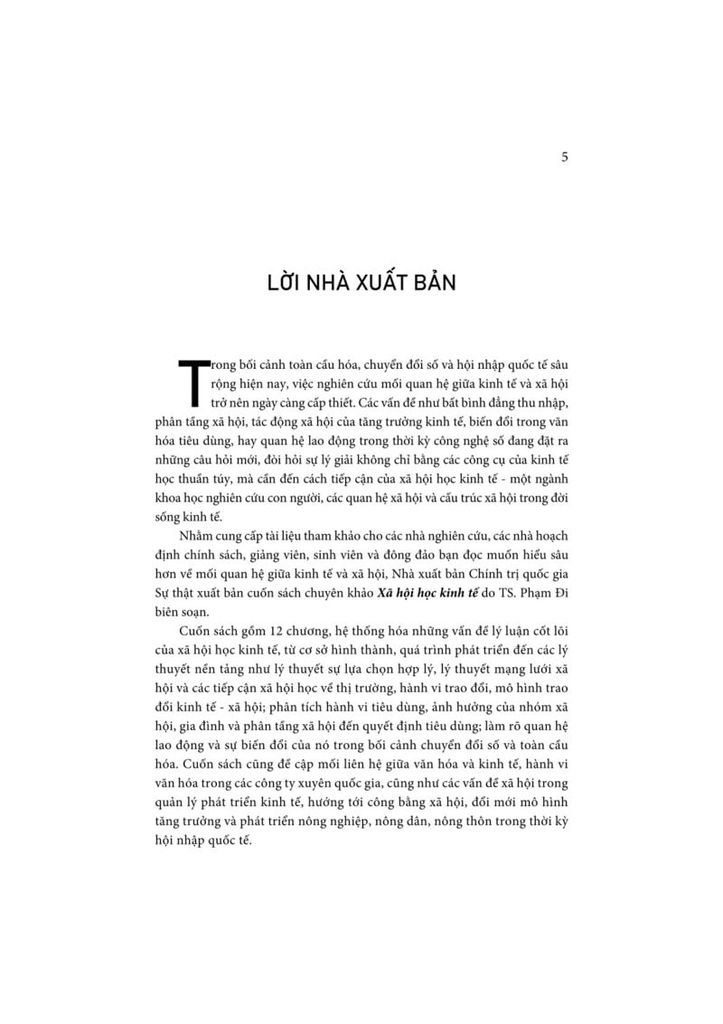 Trong bối cảnh toàn cầu hóa và chuyển đổi số diễn ra mạnh mẽ, mối quan hệ giữa kinh tế và xã hội ngày càng trở nên phức tạp, đòi hỏi những cách tiếp cận đa chiều và sâu sắc hơn. Cuốn sách Xã hội học kinh tế ra đời như một tài liệu chuyên khảo có giá trị, giúp người đọc hiểu rõ hơn sự vận động của đời sống kinh tế không chỉ qua những con số, mà còn qua các yếu tố xã hội, văn hóa và con người.