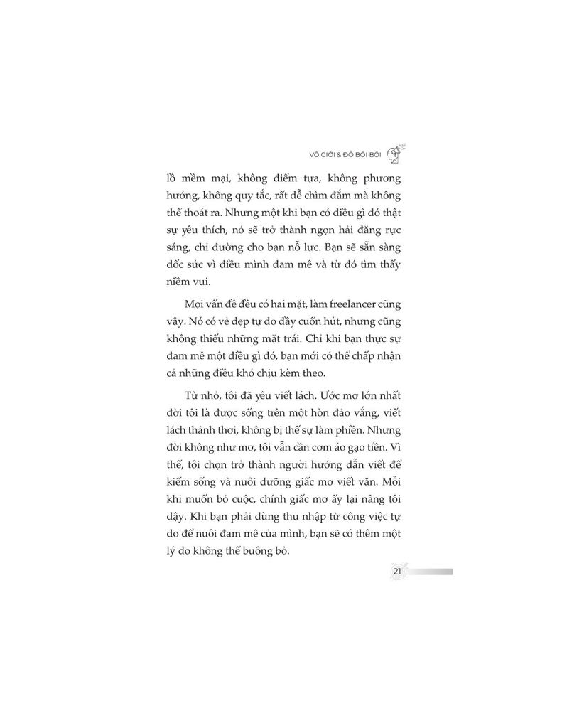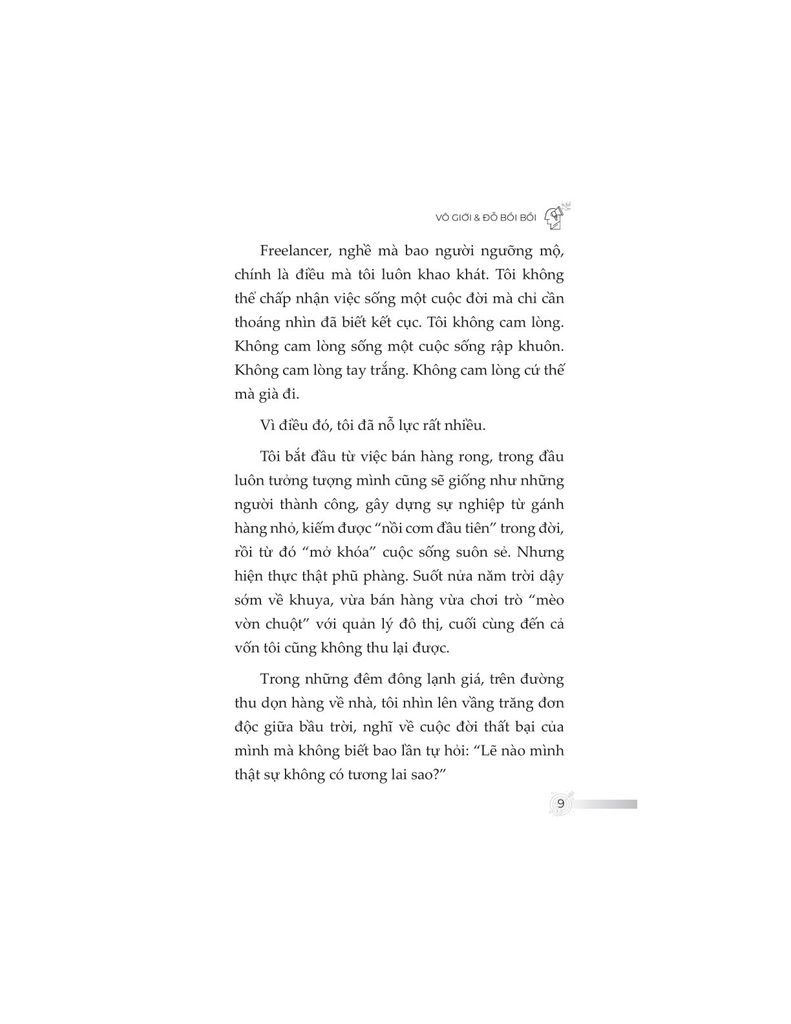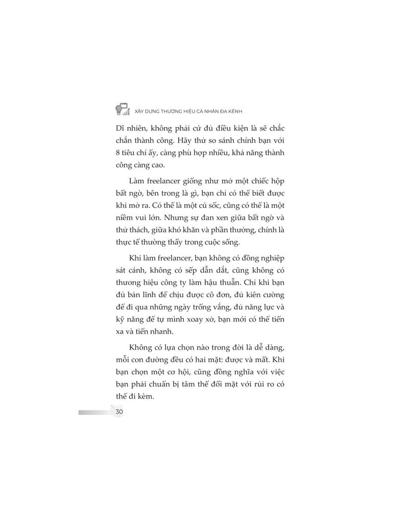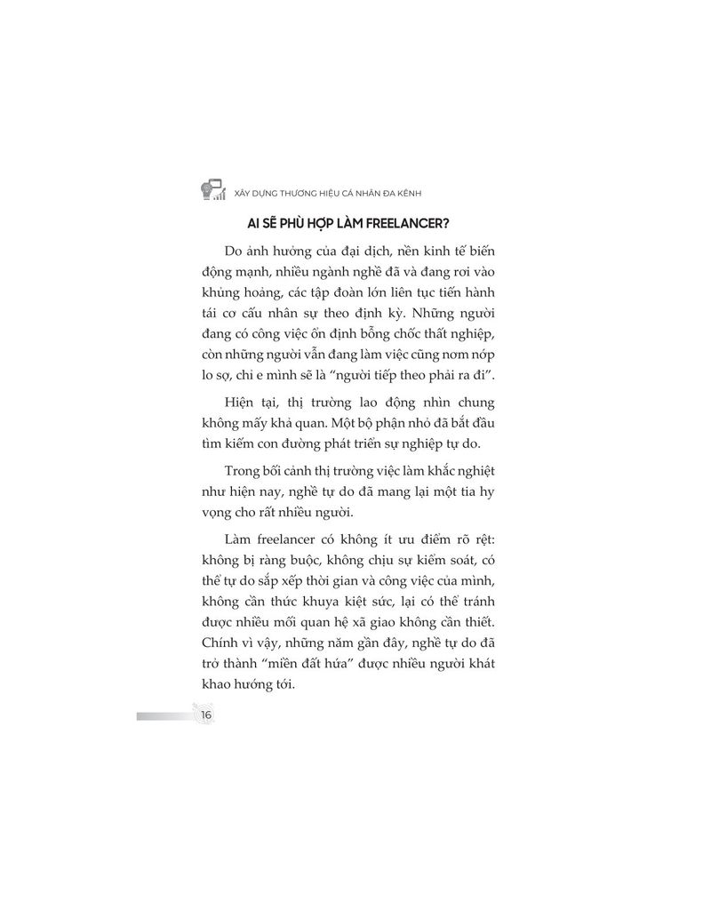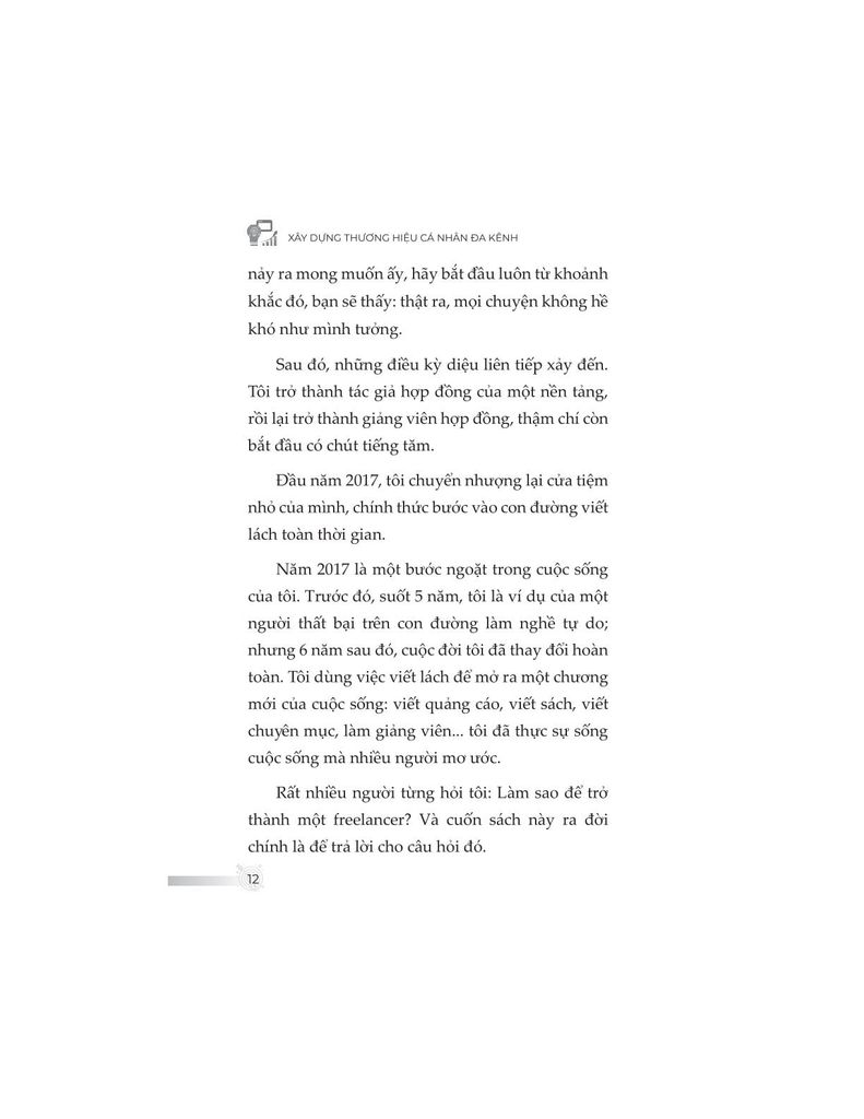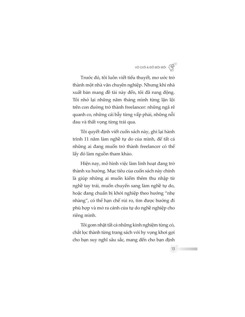 Không đơn thuần trình bày kiến thức khô khan, nội dung sách được đúc kết từ chính hành trình hơn một thập kỷ làm freelancer của tác giả – từ những thất bại chạm đáy, các mô hình thử nghiệm thực tiễn, cho đến những thành quả như trở thành giảng viên, tác giả chuyên mục, người làm nội dung toàn thời gian. Từ đó, độc giả không chỉ học được “làm như thế nào”, mà còn hiểu “tại sao lại làm như vậy”.