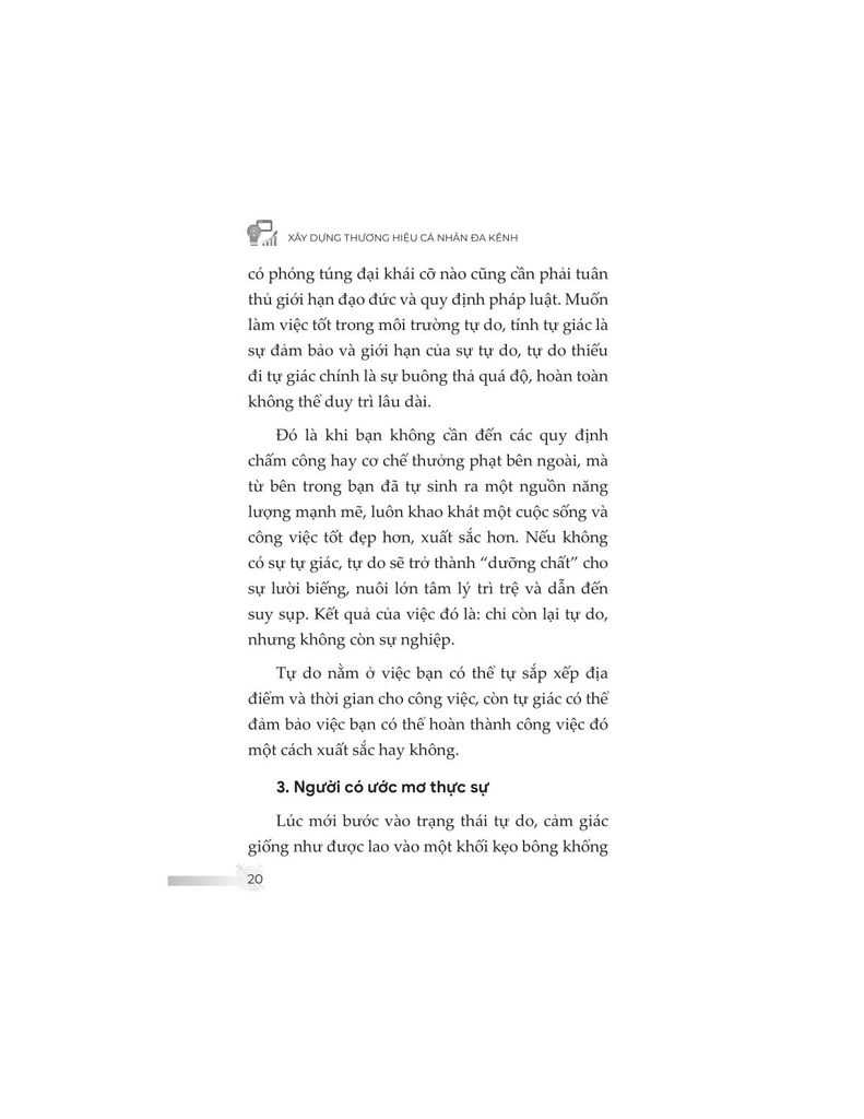 Một điểm đặc biệt đáng chú ý là tính ứng dụng cao: sách không chỉ bàn đến lý thuyết xây dựng thương hiệu cá nhân, mà còn cụ thể hóa từng bước bằng những kỹ năng thiết yếu như viết nội dung, livestream, thiết lập hệ sinh thái sản phẩm, phân tích thị trường, đo lường hiệu quả kênh… Các chiến lược đều được thiết kế phù hợp với bối cảnh người làm nghề tự do, người khởi nghiệp quy mô nhỏ, hoặc cá nhân phát triển thương hiệu trong nền kinh tế sáng tạo.