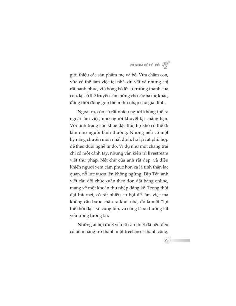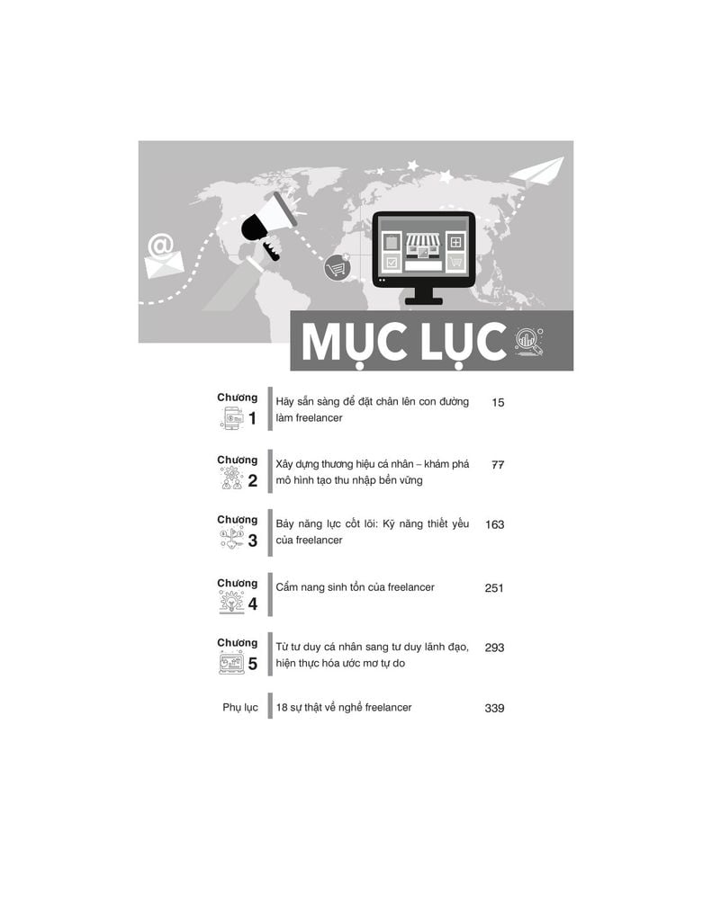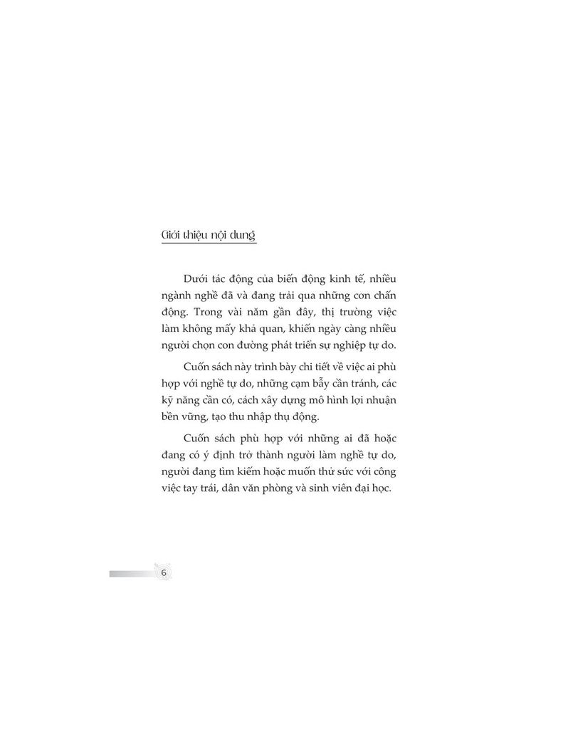 Cuốn sách được cấu trúc theo 5 chương chính và một phụ lục, lần lượt dẫn dắt người đọc từ giai đoạn đầu khám phá nghề freelancer, đến việc xây dựng mô hình thu nhập bền vững thông qua thương hiệu cá nhân, phát triển kỹ năng cốt lõi, vượt qua những trở ngại đặc thù của nghề tự do, và cuối cùng là tư duy lãnh đạo – như một bước chuyển hóa từ người làm nghề sang người dẫn dắt cộng đồng.