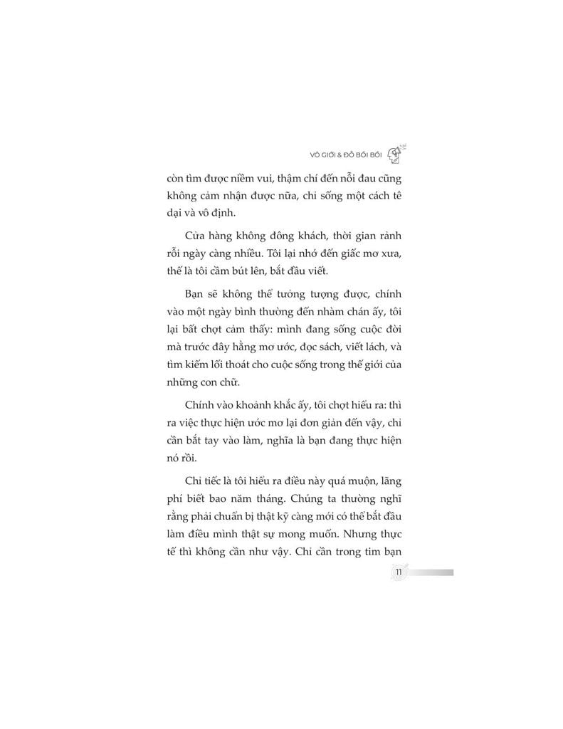 Vô Giới là một cây bút giàu nội lực và kinh nghiệm thực chiến, với hơn một thập kỷ theo đuổi nghề freelancer trong lĩnh vực viết lách, giảng dạy và sản xuất nội dung số. Xuất phát điểm là một người tay trắng, trải qua nhiều lần thất bại và vật lộn mưu sinh, anh từng bán hàng rong, mở cửa tiệm, làm nông và tự học mọi kỹ năng cần thiết để chuyển mình trở thành một tác giả toàn thời gian. Hành trình của Vô Giới là minh chứng sống động cho năng lực kiến tạo thương hiệu cá nhân từ con số 0 – không dựa vào nền tảng hay mối quan hệ sẵn có, mà bằng sự bền bỉ, tư duy dài hạn và khả năng thích nghi trong môi trường số.