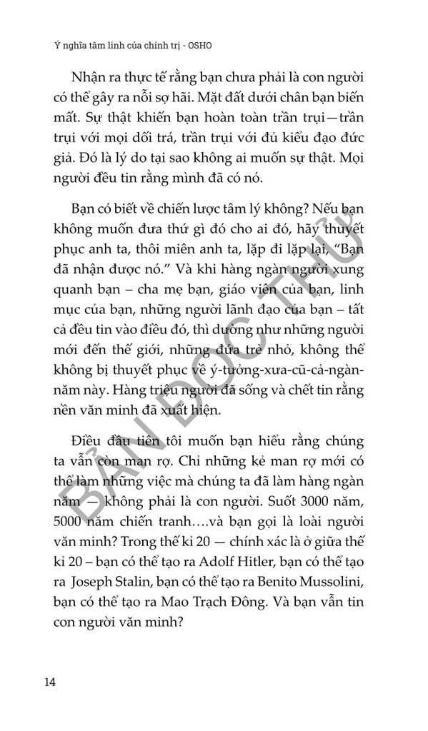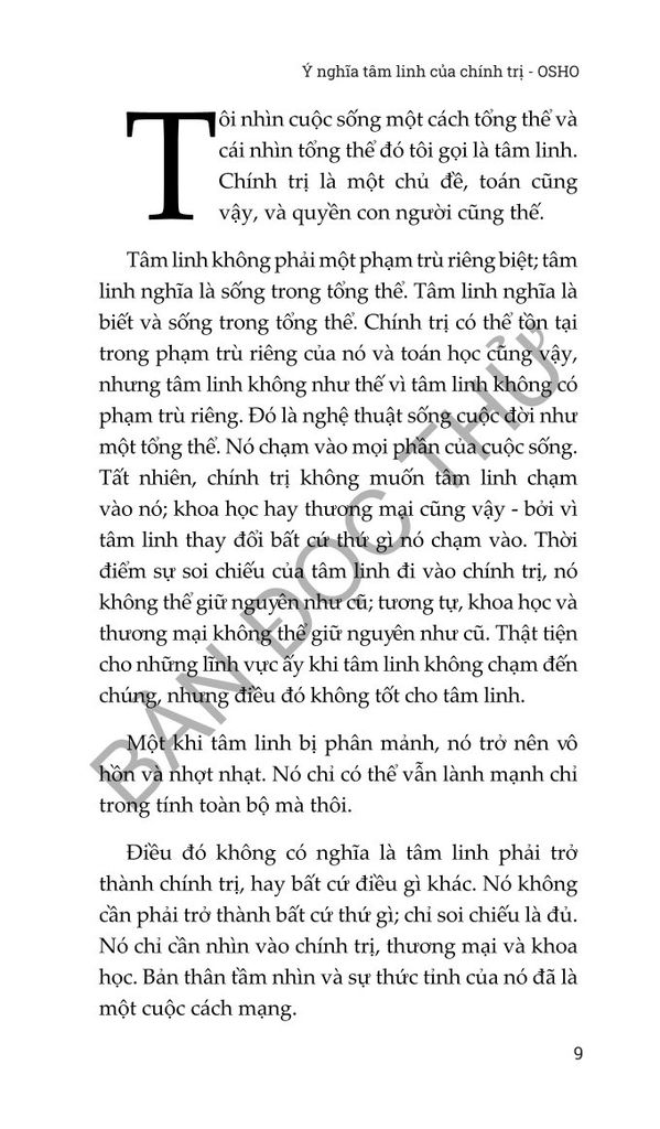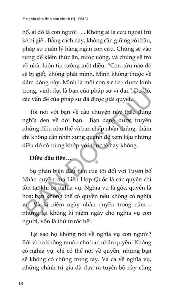 Ý nghĩa tâm linh của chính trị của Osho đi sâu vào các khía cạnh cơ bản của những gì cấu thành nên quyền con người từ góc độ tâm linh và triết học. Osho, được biết đến với những lời dạy sâu sắc và táo bạo, thách thức những quan điểm thông thường về quyền con người, kêu gọi người đọc xem xét lại hiểu biết của họ về tự do, bình đẳng và công lý trong bối cảnh chuyển đổi nội tâm và ý thức. Tác phẩm này có thể mang đến sự kết hợp độc đáo giữa tinh thần và trí tuệ thực tế về cách tiếp cận quyền con người vượt ra ngoài các chuẩn mực pháp lý hoặc xã hội, thay vào đó tập trung vào vai trò của cá nhân trong việc công nhận và thể hiện các quyền này trong cuộc sống hàng ngày.